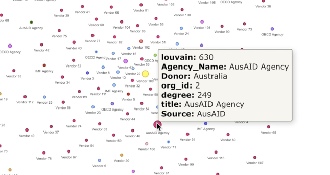 The project is purposed to help users navigate the performance of some government infrastructure programs by visualising the complex inner dependencies among a huge number of projects, organisations, and vendors etc, with the help of graph databases.