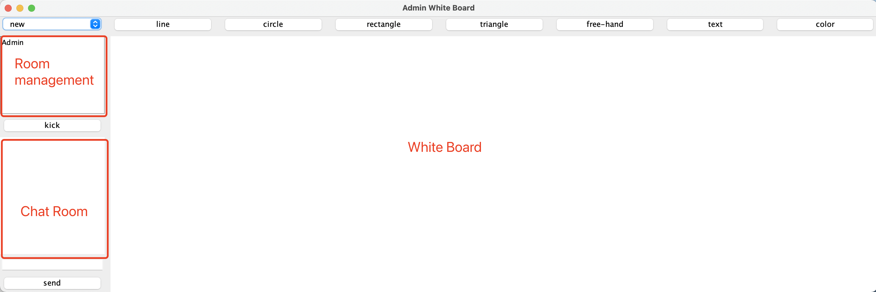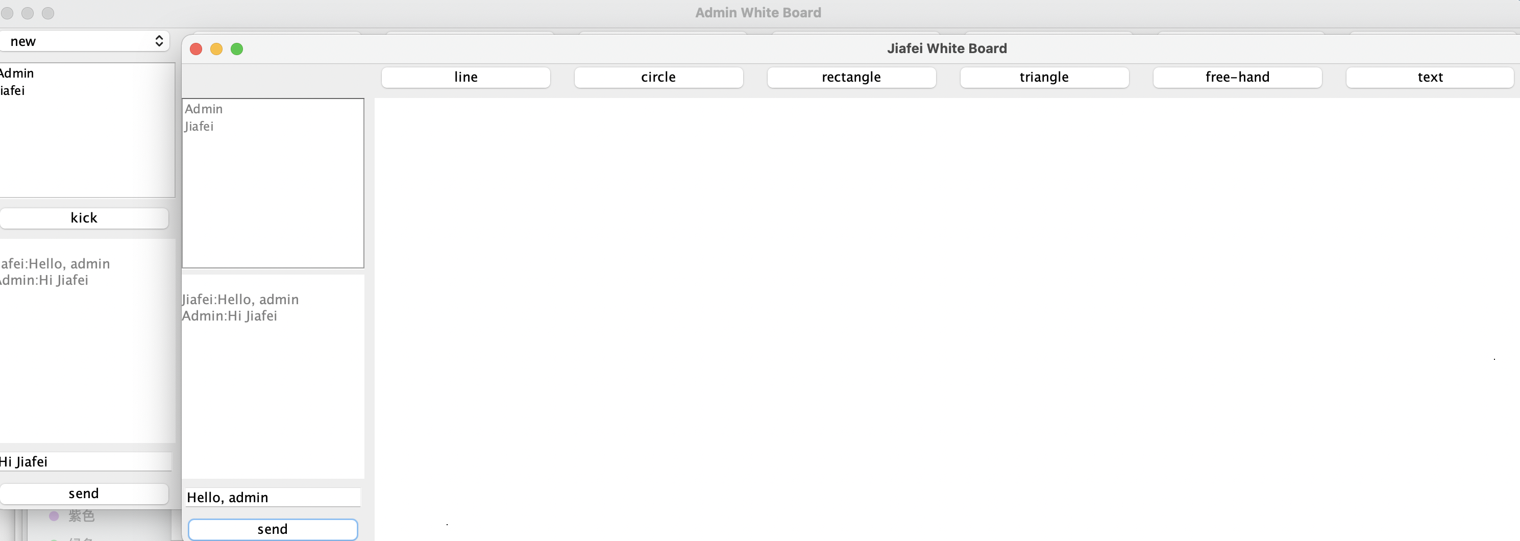 The purpose of this project is to use the TCP/IP network framework to build a shared whiteboard system. In this project, there are two roles: Admin and User. The admin can open a shared drawing board, and other users can join and exit the drawing board at any time. In the shared artboard, users and admins can draw on the artboard together and conduct online chat functions.