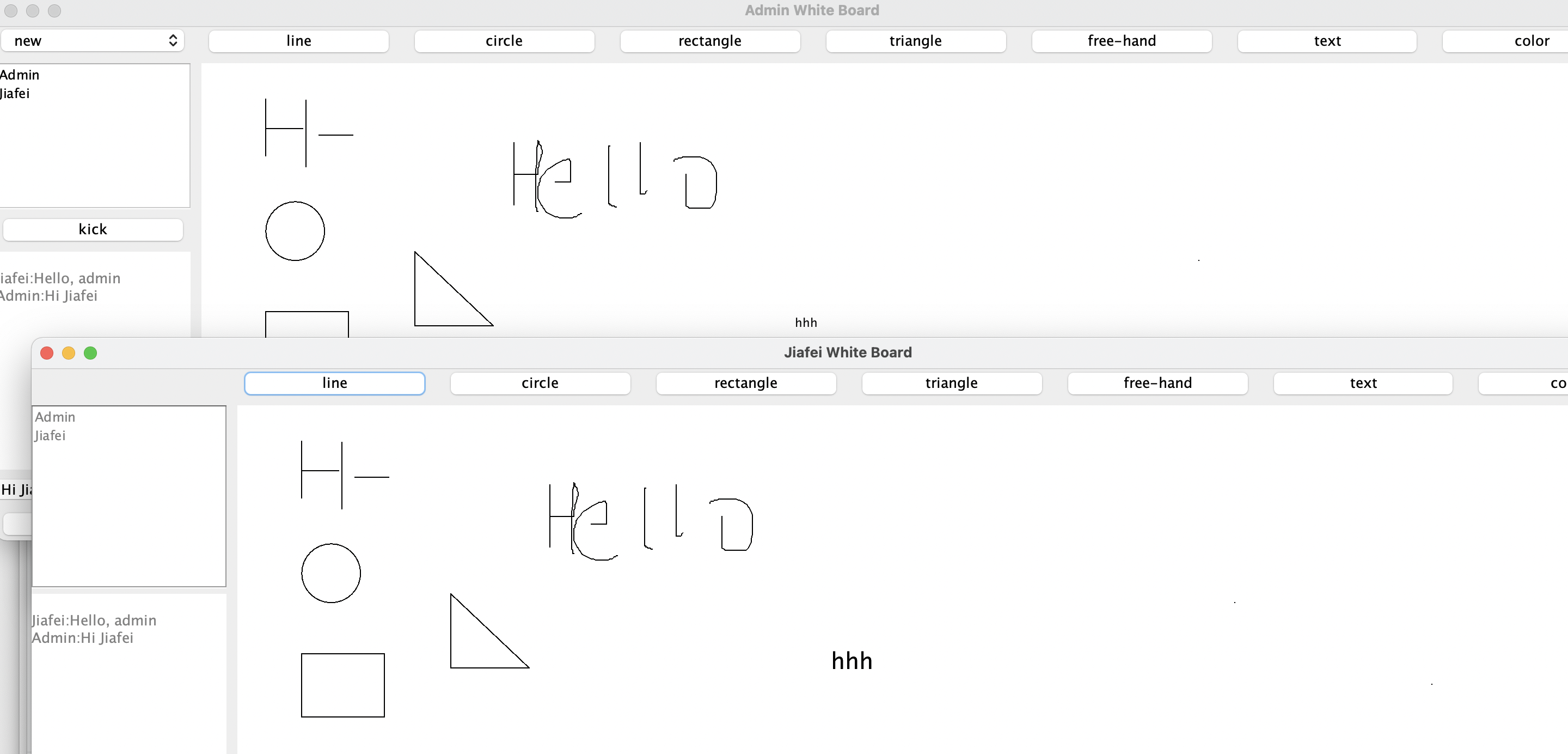 This is main feature of this project. Everyone in the room is able to draw everything in the whiteboard. There are some predefind shapes that the user can choose to draw, including line, circle, rectangle, triangle, and even text.
